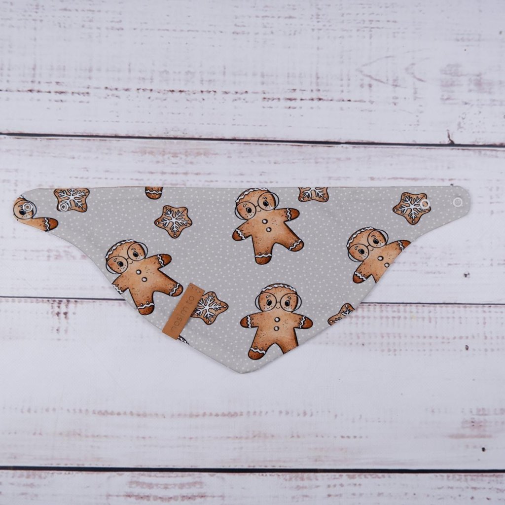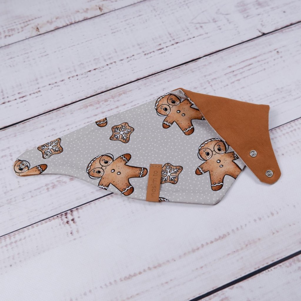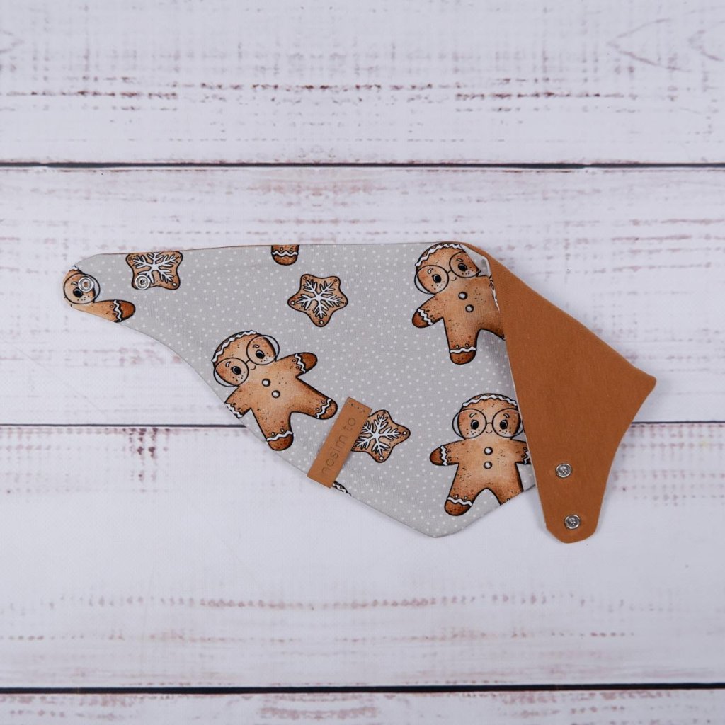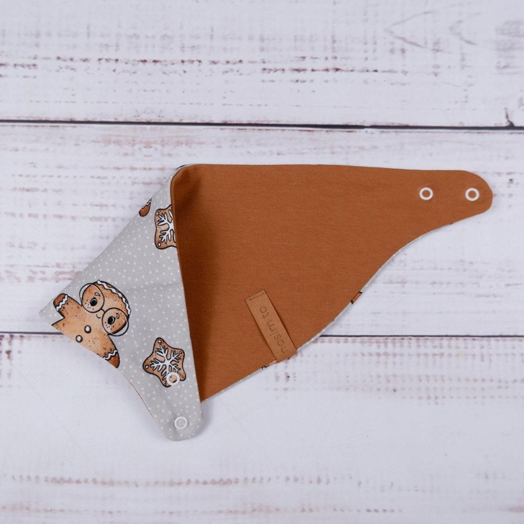 Slintáček s motivem perníčků v teplém karamelovém tónu je nejen roztomilý, ale hlavně funkční. Díky zapínání na dva druky se snadno přizpůsobí krčku dítěte a oblékání je rychlé a bez přetahování přes hlavu. Z jedné strany najdete perníčkový design, z druhé jemnou teplákovinu v karamelové barvě – stačí otočit podle potřeby.