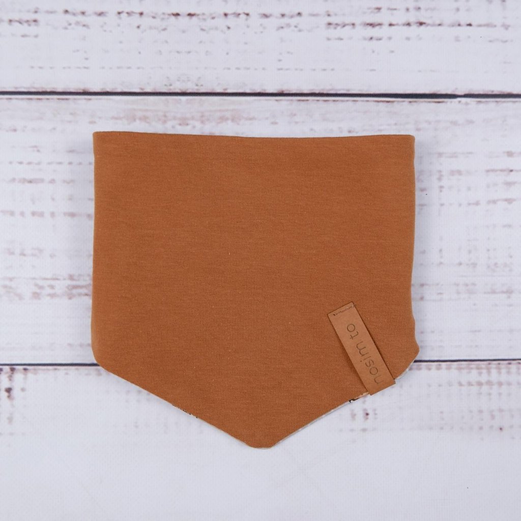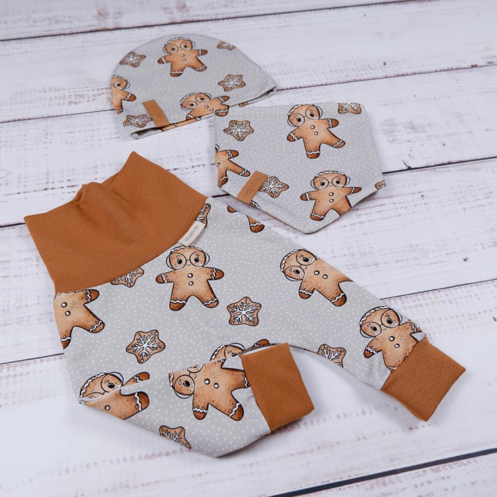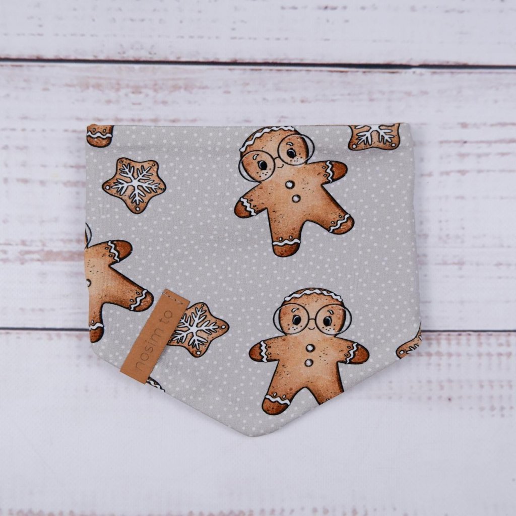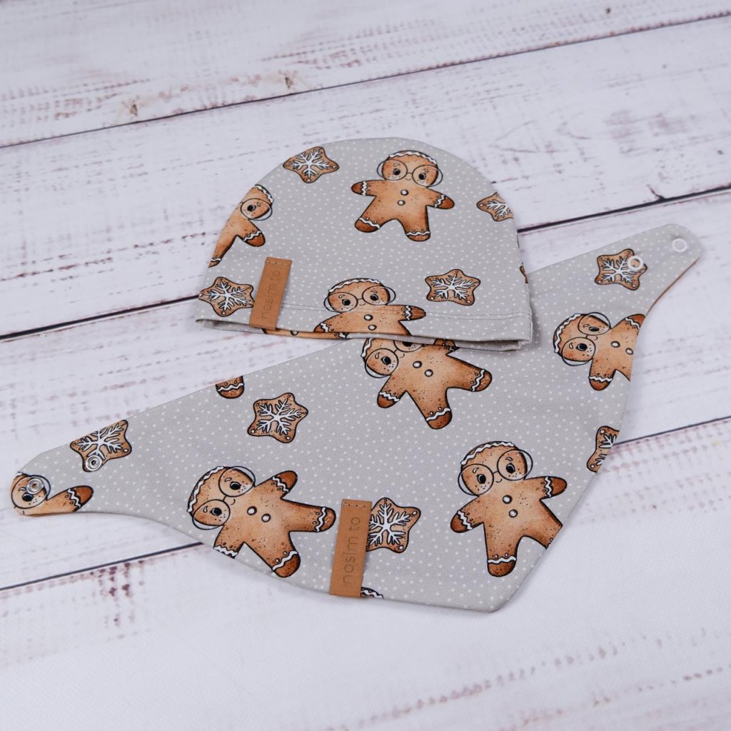 Slintáček s motivem perníčků v teplém karamelovém tónu je nejen roztomilý, ale hlavně funkční. Díky zapínání na dva druky se snadno přizpůsobí krčku dítěte a oblékání je rychlé a bez přetahování přes hlavu. Z jedné strany najdete perníčkový design, z druhé jemnou teplákovinu v karamelové barvě – stačí otočit podle potřeby.